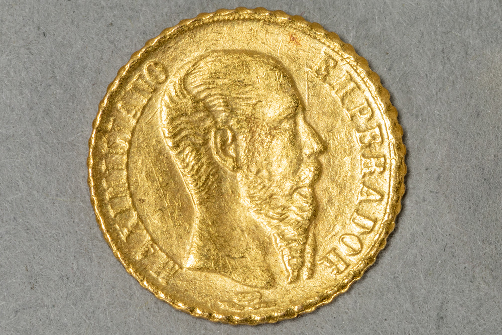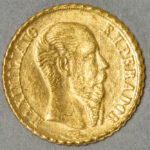 18-karaats gouden replica van een Mexicaanse munt uit 1865, vaak gegeven als trouwcadeau – diameter : 10 mm – gewicht : 0,5 gram