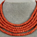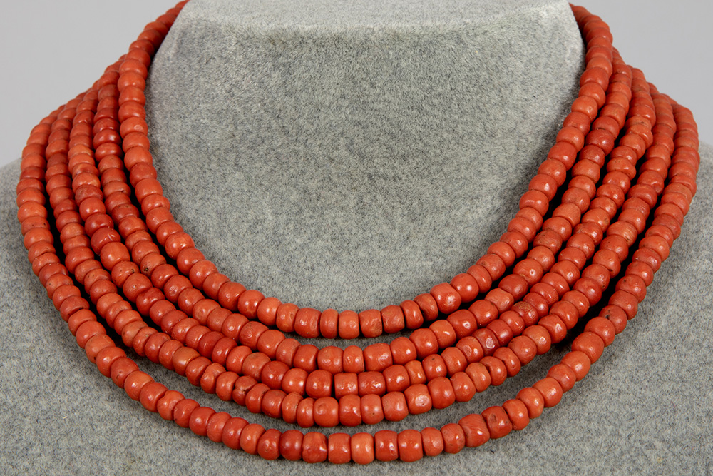 Antiek collier met vijf snoeren kralen van rode koraal en met slot in geelgoud (14 karaat) bezet met koraal – lengte : 38 cm – gewicht : 120 gram