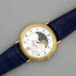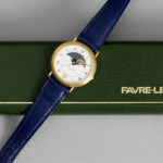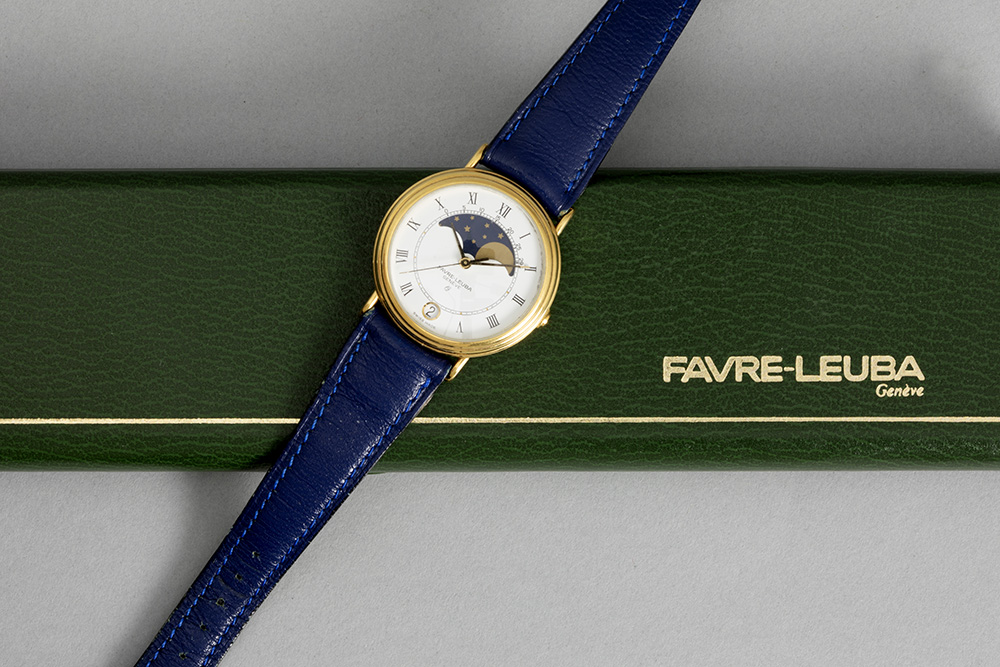 FAVRE-LEUBA quartz polshorloge in goud op staal met moonphase en datumaanduiding en met lederen band – in originele doos gemerkt