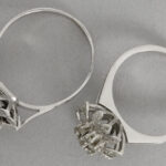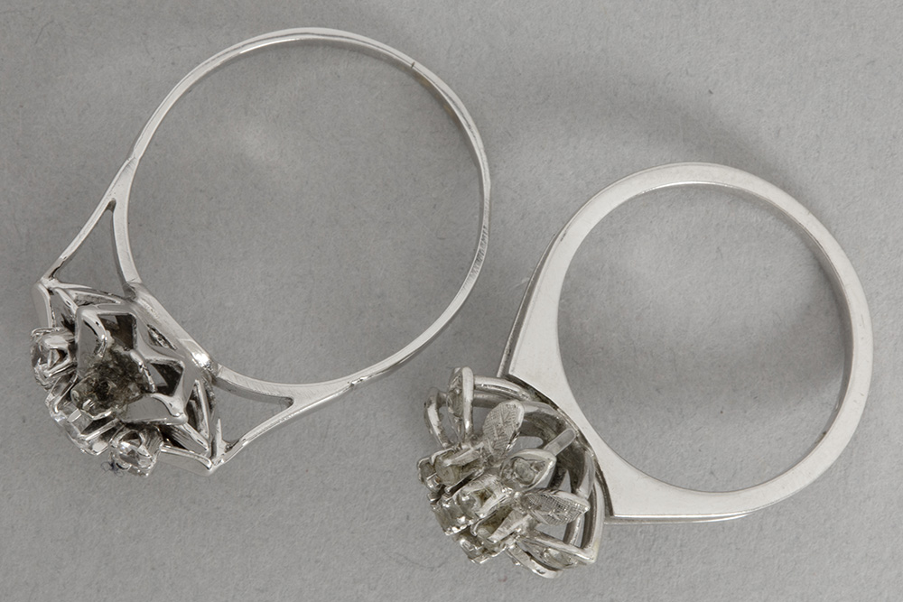 Lot van twee ringen in witgoud (18 karaat) telkens met bloemvormig sierstuk, bezet met zirkonia – gewicht : 8,8 gram