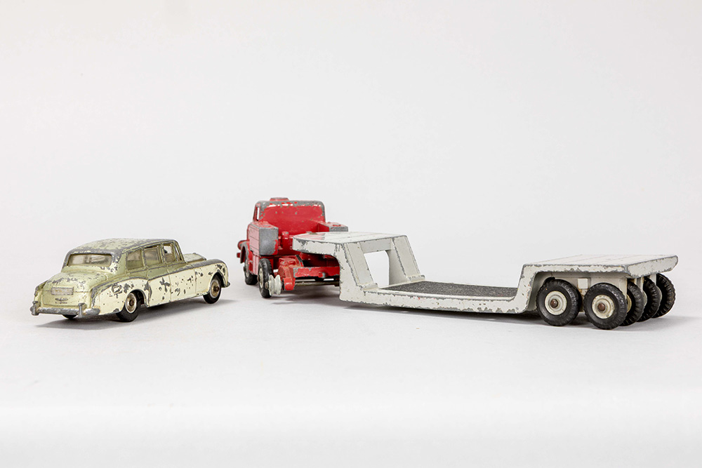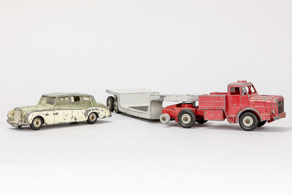 Lot van twee Dinky Toys gemerkte autootjes : een vrachtwagen met aanhanger en een Rolls Royce