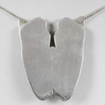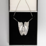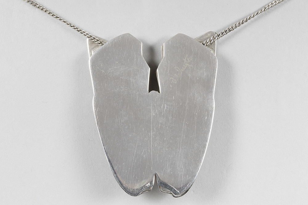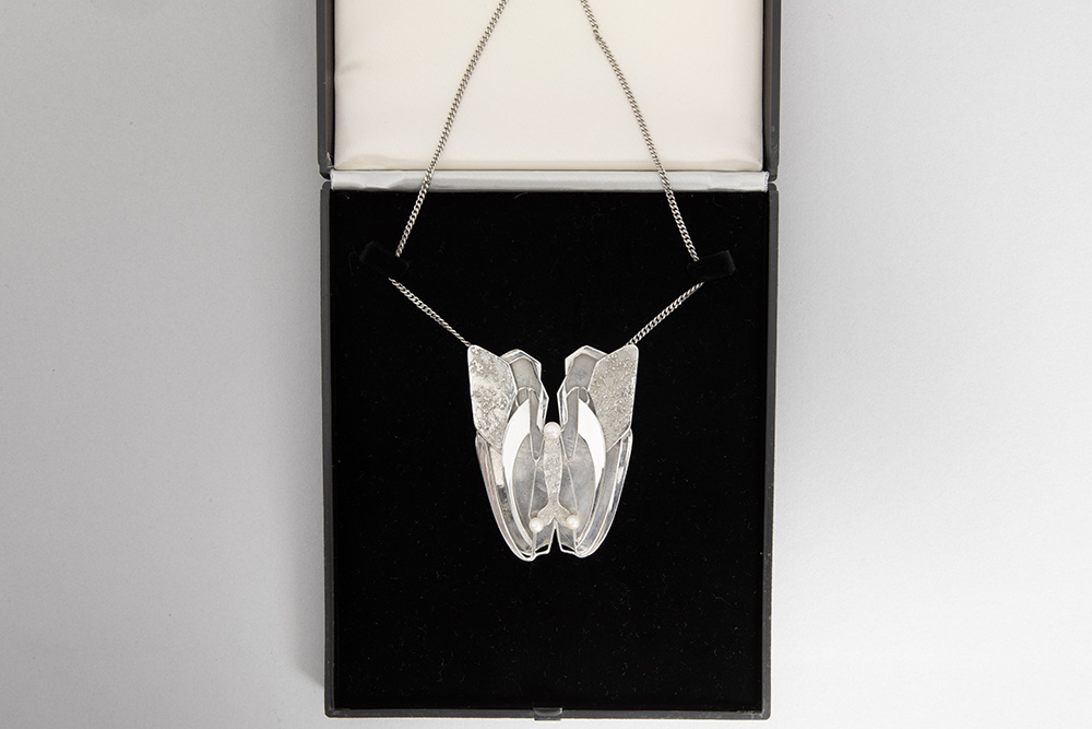 WUYTS J design collier, genaamd “L’origine/Papillon”, in zilver met drie parels – gewicht (met ketting) : 57,7 gram – ca 1980 getekend