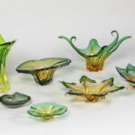 Lot (7) kristal Val-St-Lambert en Italiaans Muranoglas met geel-groene gradiënt
