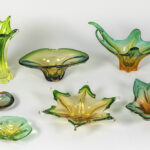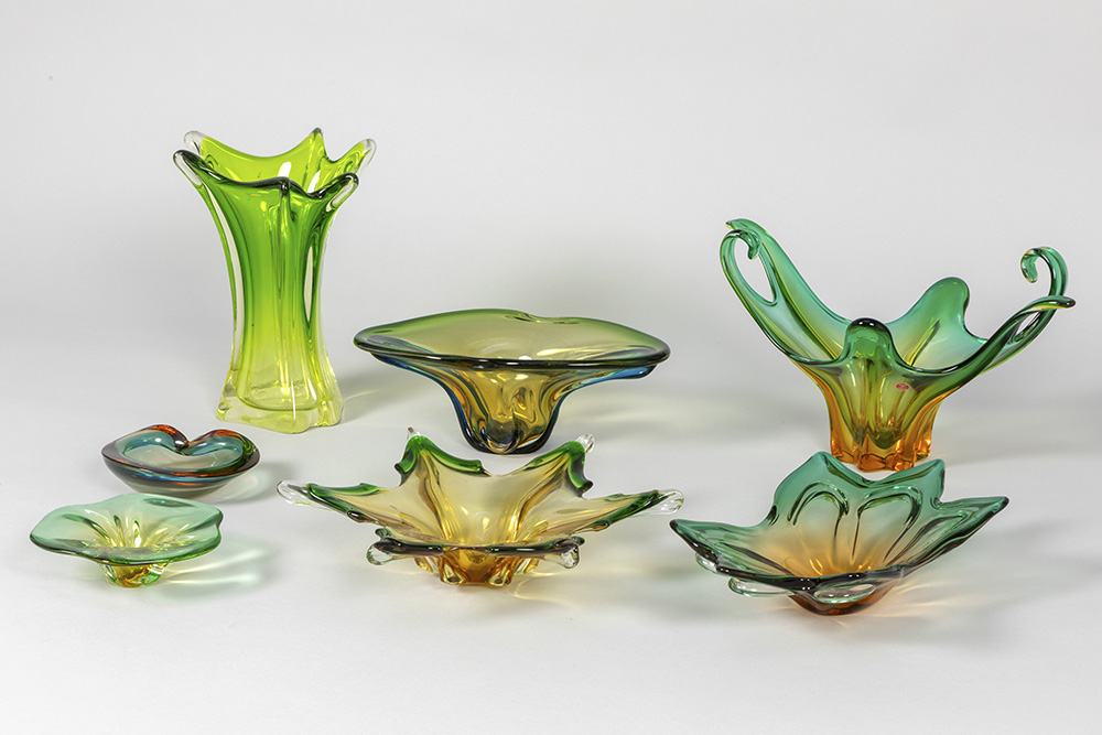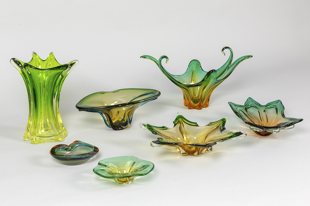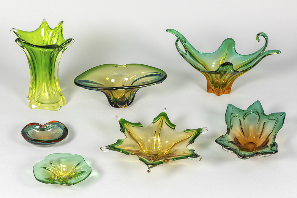 7 pieces of crystal Val-St-Lambert and Italian Muranoglass with yellow-green gradient