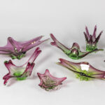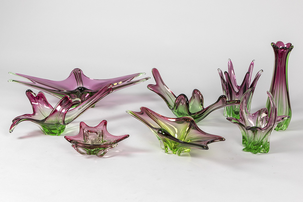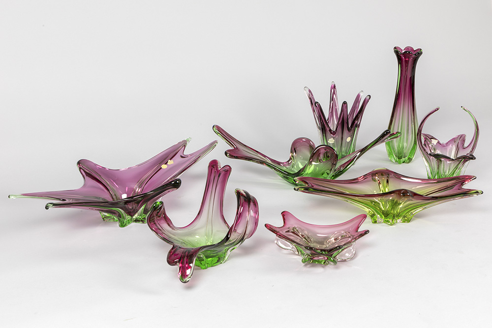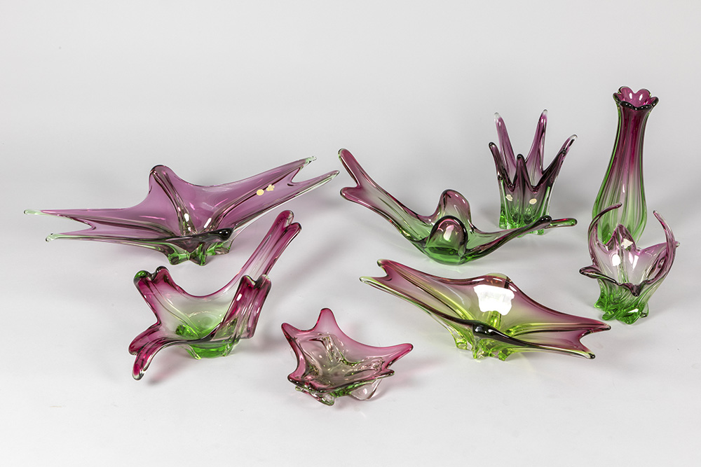 8 pieces of crystal Val-St-Lambert and Italian Muranoglass with purple-green gradient