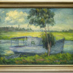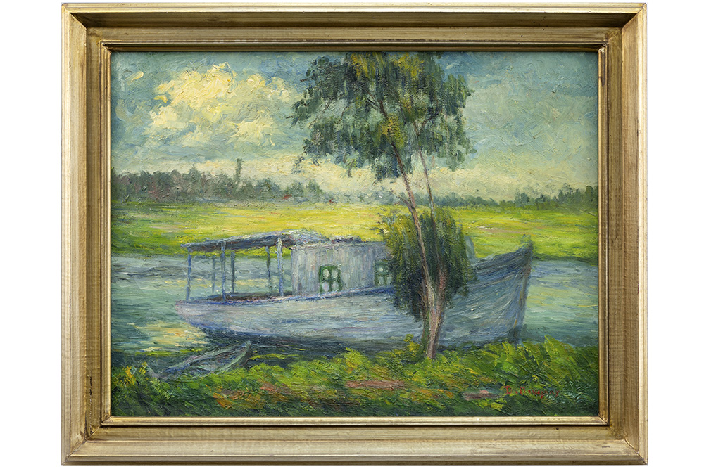 NEVEJANS DANIEL ARTHUR (1881 – 1934) olieverfschilderij op doek : “Bootje op de Schelde” – 60 x 80 getekend en met op verso een dedicatie aan zijn leermeester Herman Broeckaert