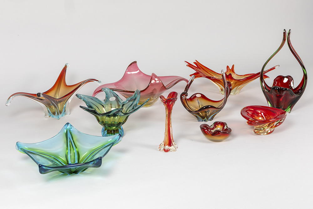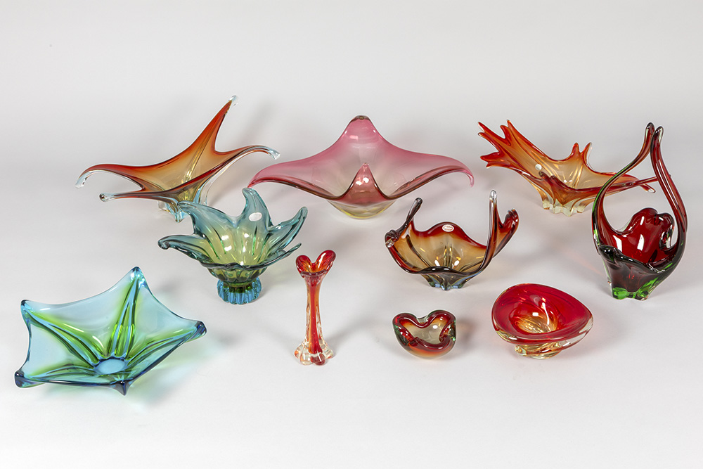 Lot (10) Italiaans Muranoglas, telkens met twee ingewerkte kleuren in helder glas