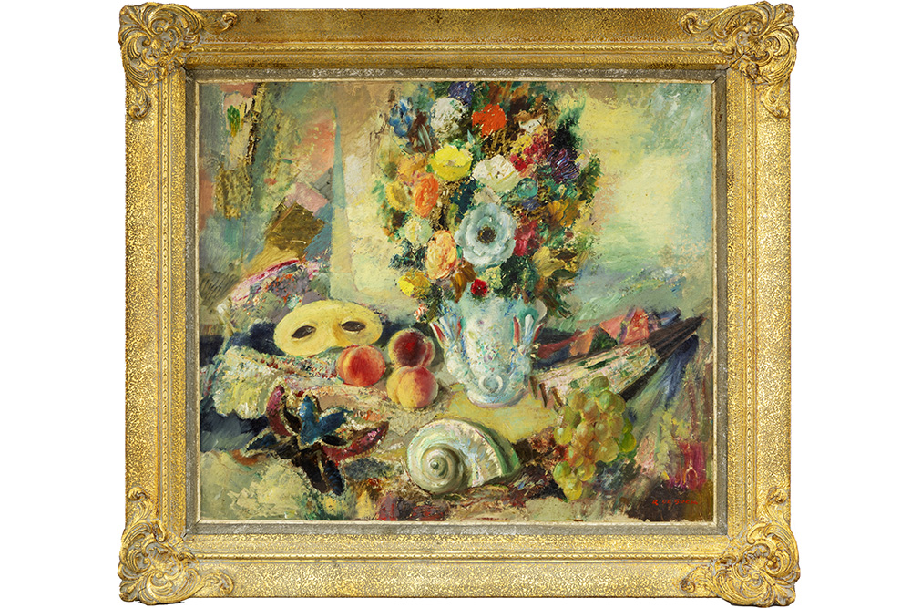 DE BUCK RAPHAEL (1902 – 1986) olieverfschilderij op paneel : “Stilleven met carnavalsmaskers” – 60 x 70 getekend