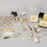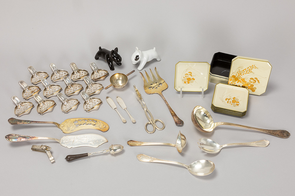 Varia met plezant peper- en zoutstel in porselein en met verzilverd metaal (waaronder citroenpersjes)