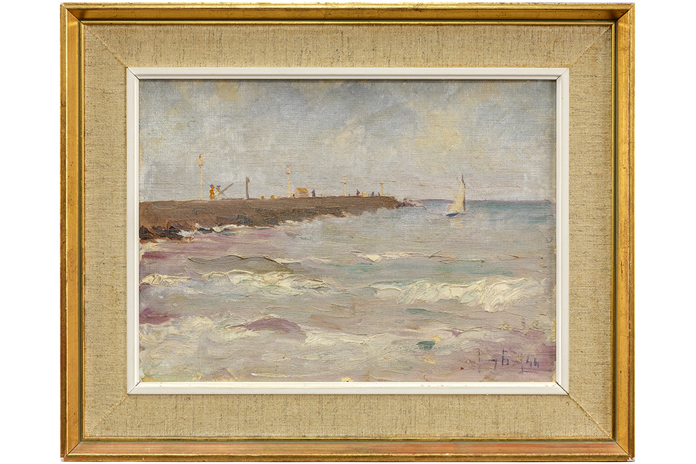 Frans onleesbaar getekend en (19)44 gedateerd olie op paneel : “Marine” – 23 x 33