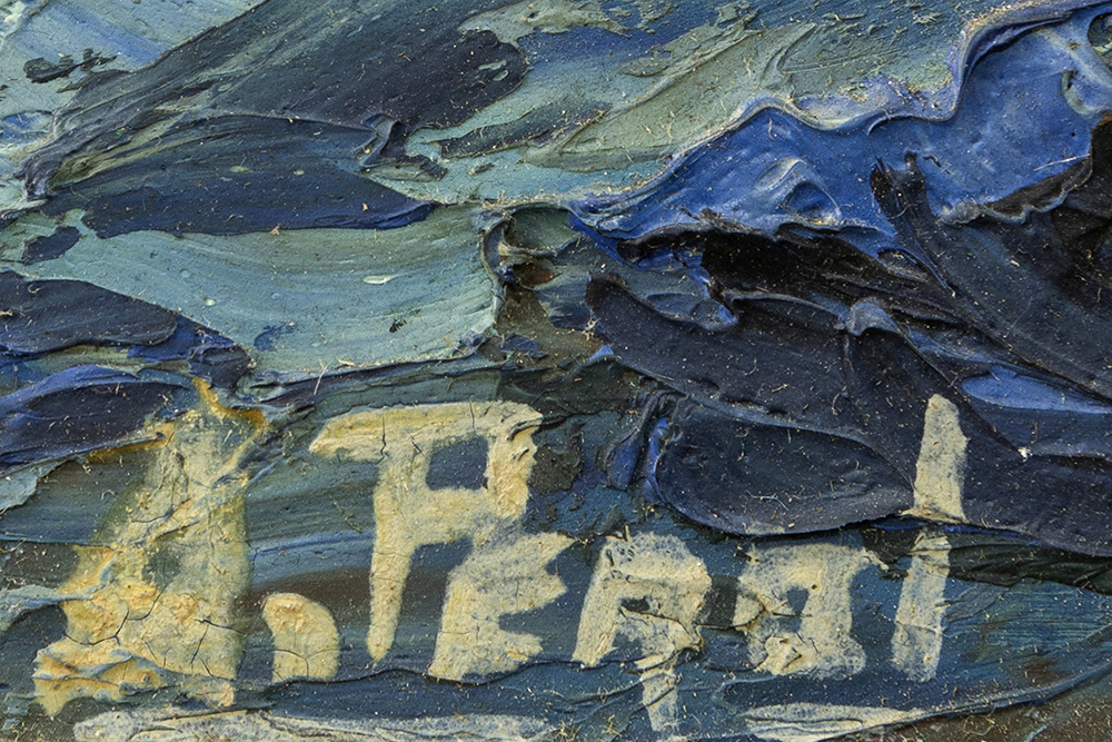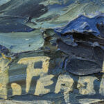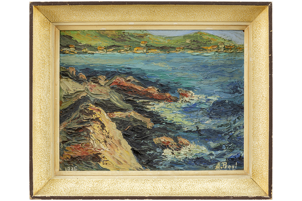 Onleesbaar getekend (Perrol ?) olieverfschilderij op paneel : “Zuiders zeezicht” – 26 x 34