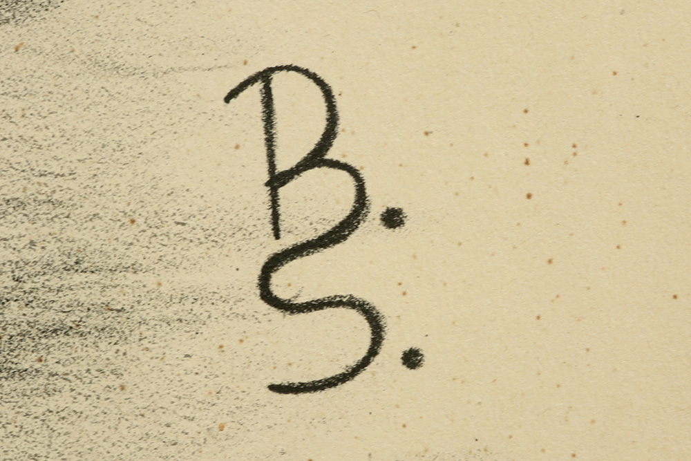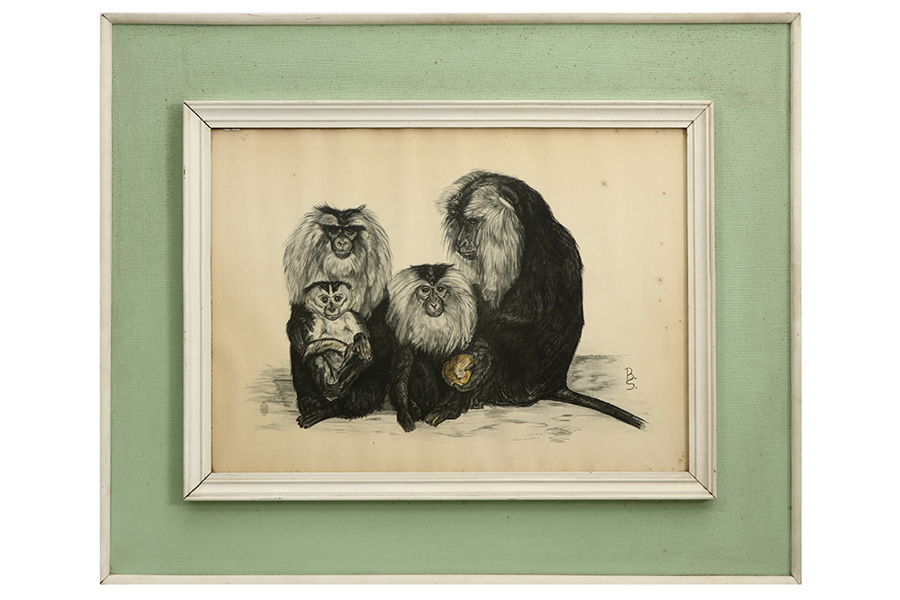 Lot 581 Lot: 581 Your Bid: B S tekening : “Apenfamilie” – 44 x 61 gemonogrammeerdB S monogrammed drawing Auctionday 28/02/2026 Estimation - euro << back to the catalogue