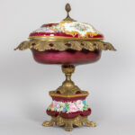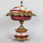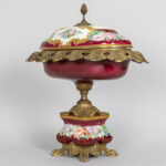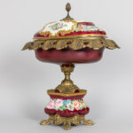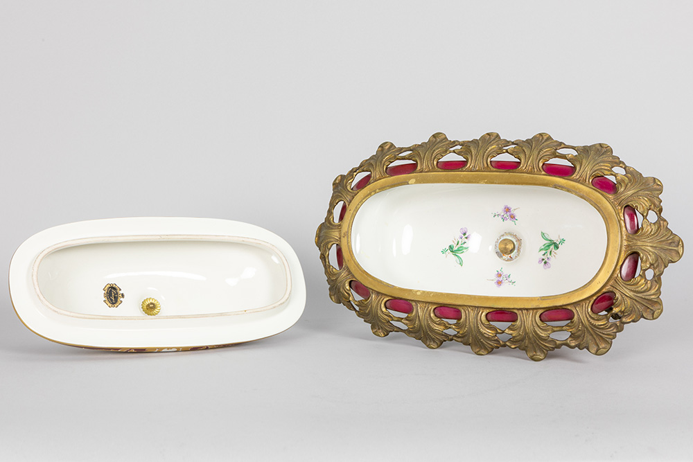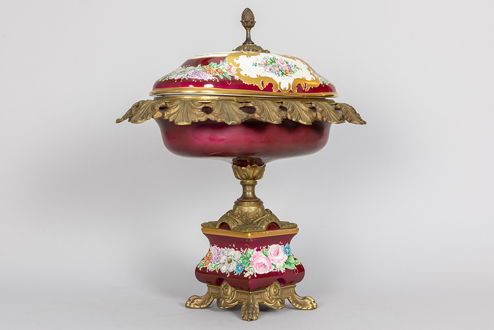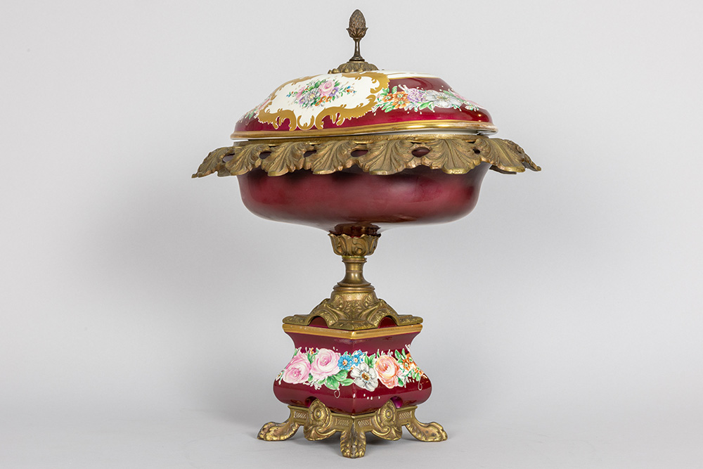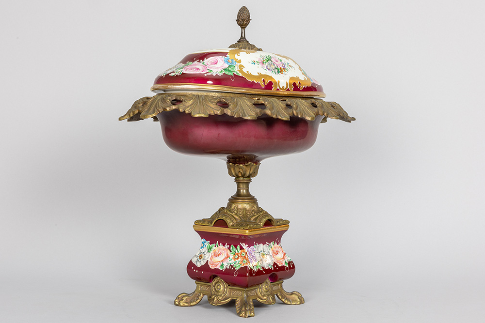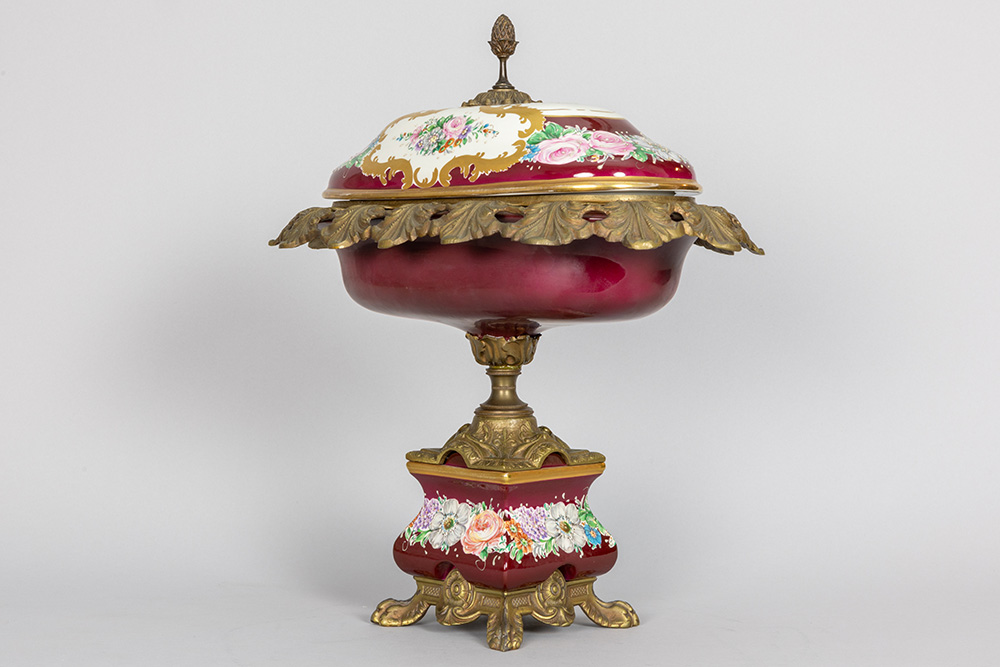 Coupe op voet in porselein gemerkt Limoges met een montuur in gedoreerd metaal – hoogte : 40 cm