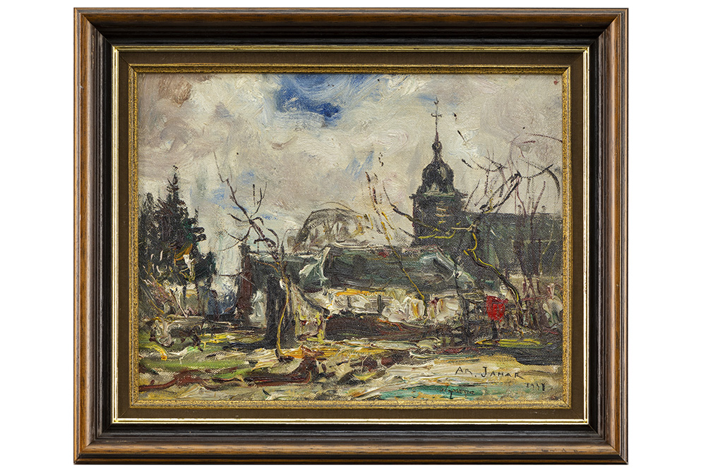 JAMAR ARMAND (1870 – 1946) olieverfschilderij op paneel : “Landschap met kerkzicht” – 26,5 x 34,5 getekend