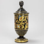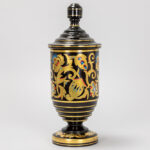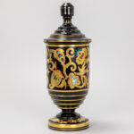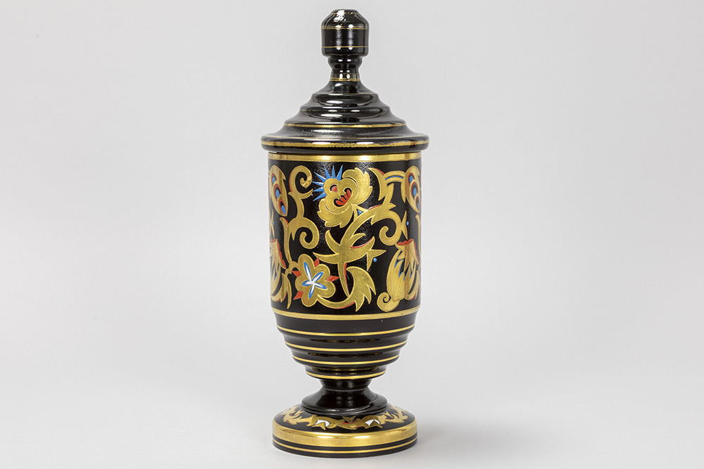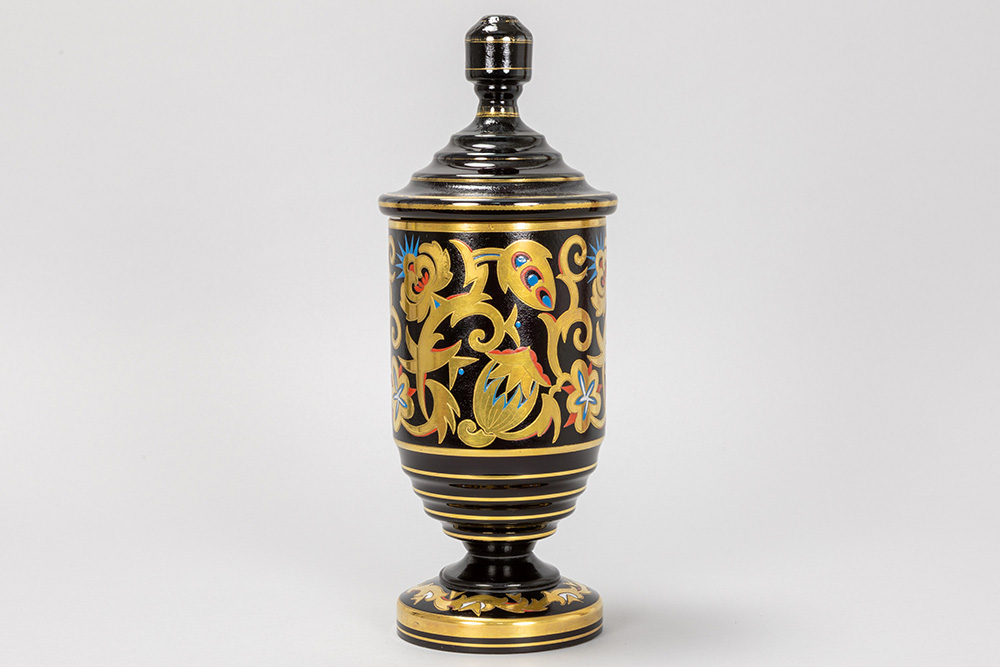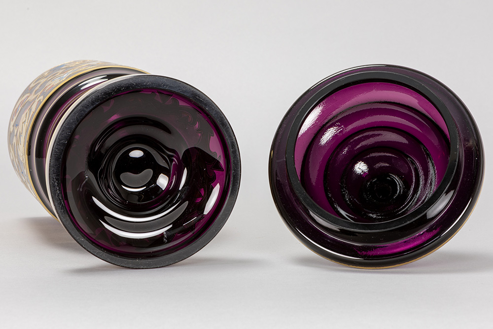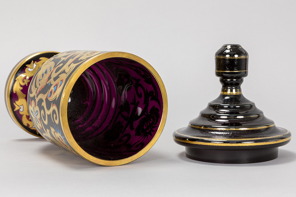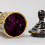 exceptional Johann Oertel (attributed) lidded vase in amethyst-colored crystal with rich decoration raised with 24 carat gold in the oroplastic technique – to be dated around 1920