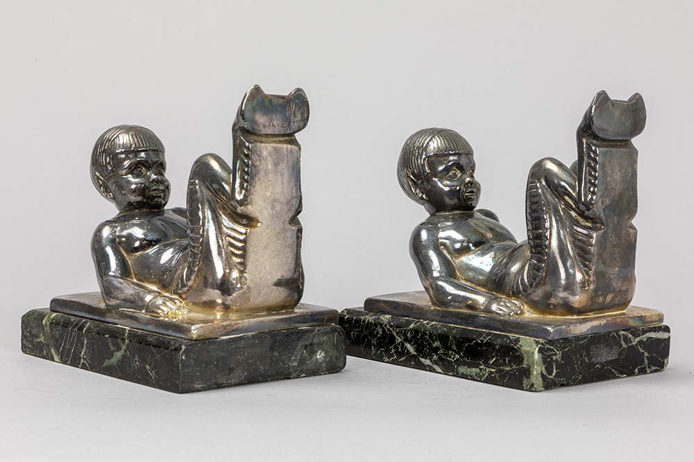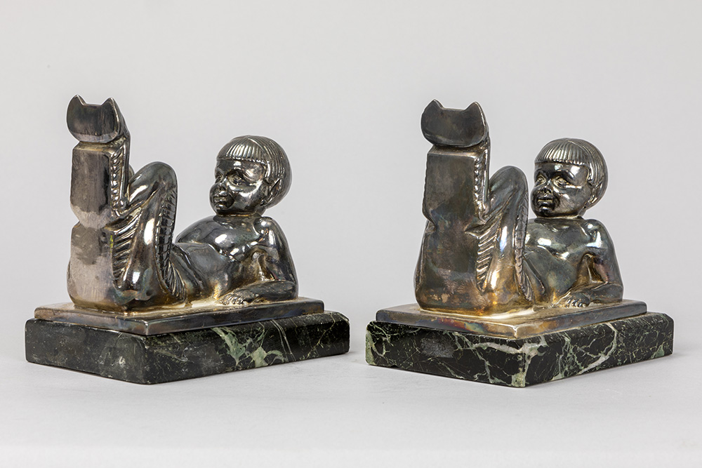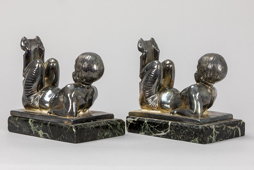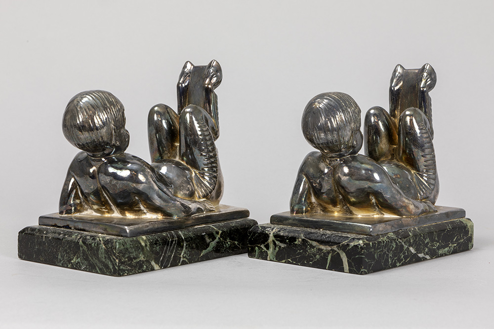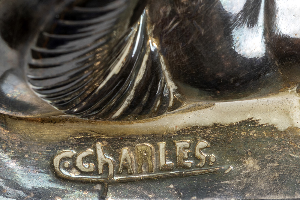 CHARLES CHARLES (XIX – XX) paar Art Deco-boeksteunen in verzilverd metaal telkens in de vorm van een liggende sater – op marmeren basis – hoogte : 13,5 cm – ca 1925 getekend