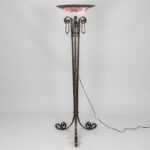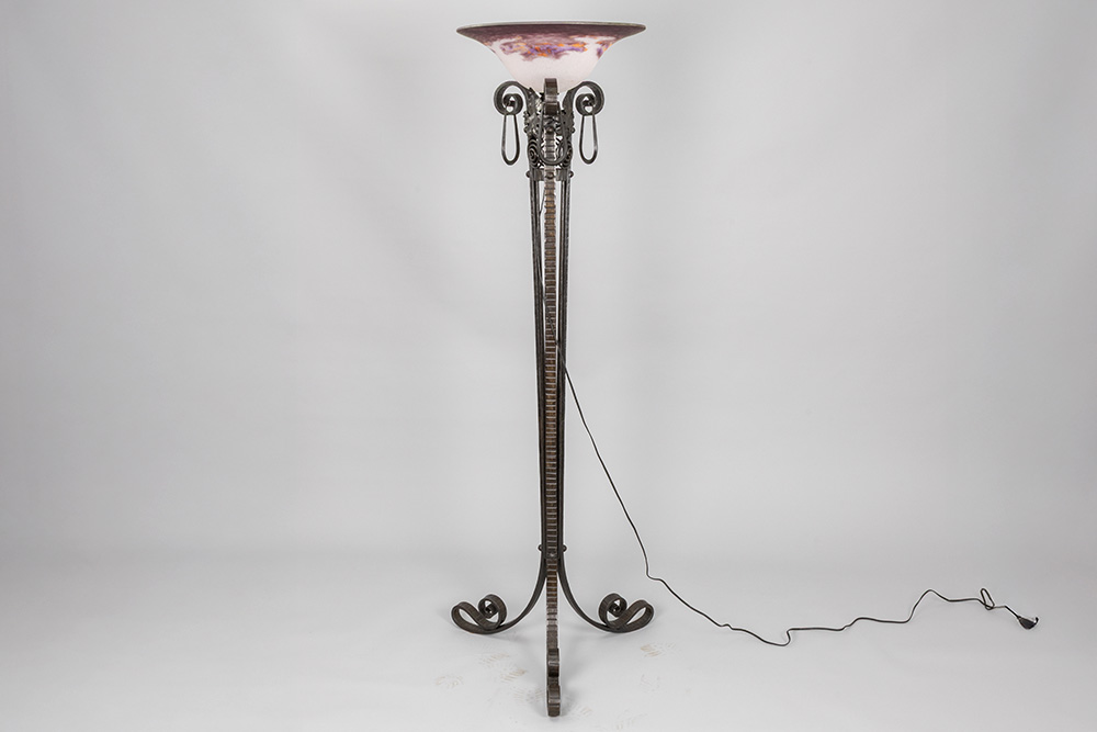 DEGUE staande Art Deco-lamp met mooie voet in smeedijzer en met coupe in gemarmerde glaspasta – hoogte : 172 cm – ca 1925 getekend