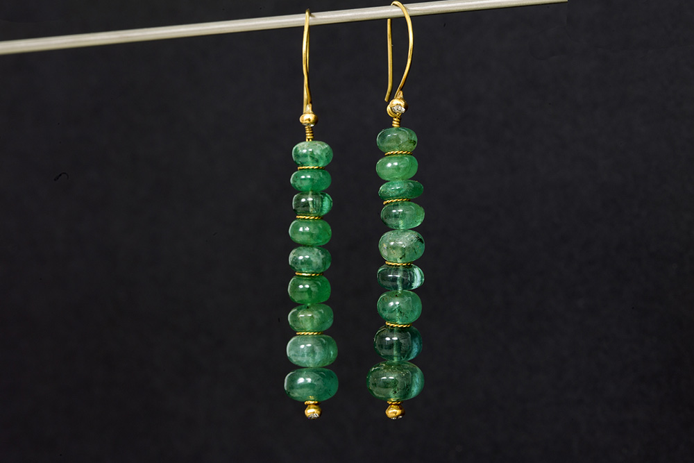 Paar oorbellen in geelgoud (22 karaat) telkens met een soort rivièremodel van cabochons in smaragd, eindigend op een briljantje – in totaal : ca 23 karaat smaragd met mooie kleur