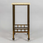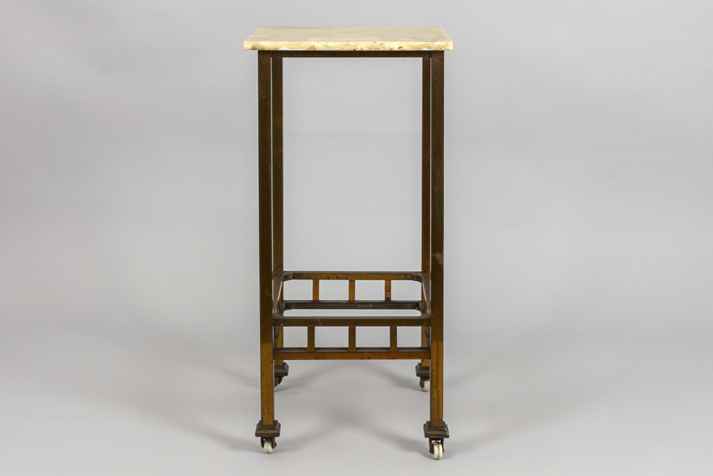 Jugendstil-bijzettafel in metaal met bronspatine, met blad in onyx en met porseleinen wieltjes – hoogte : 81 cm – ca 1900/10