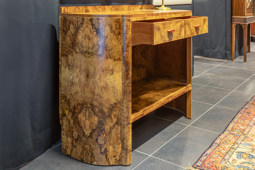Art Deco-meubel – soort dresse – in mooi gevlamd wortelhout met 2 laden en open vak – ca 1925/30 – 99 x 122 x 53 cm