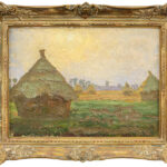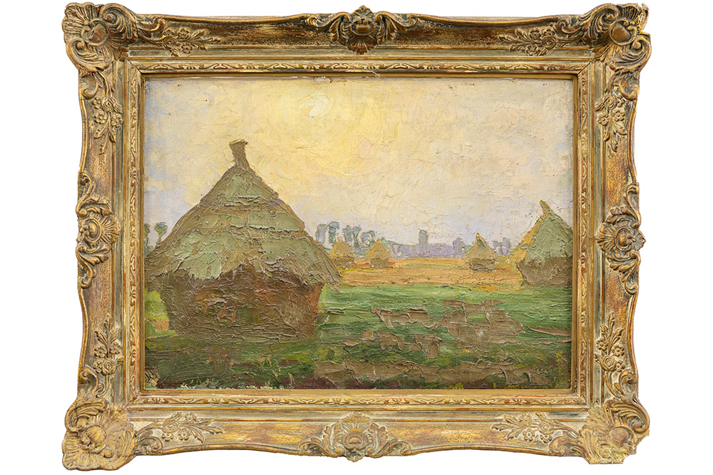 Onleesbaar getekend (K. De …) en gedateerd olieverfschilderij op doek : “Hooihoppers” – 28 x 40 te dateren rond 1910