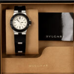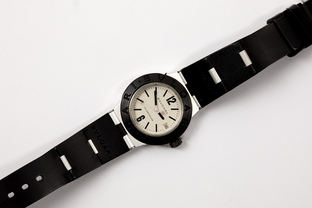 completely original quartz Bulgari marked ladies’ wristwatch in aluminum and rubber – with is box and papers