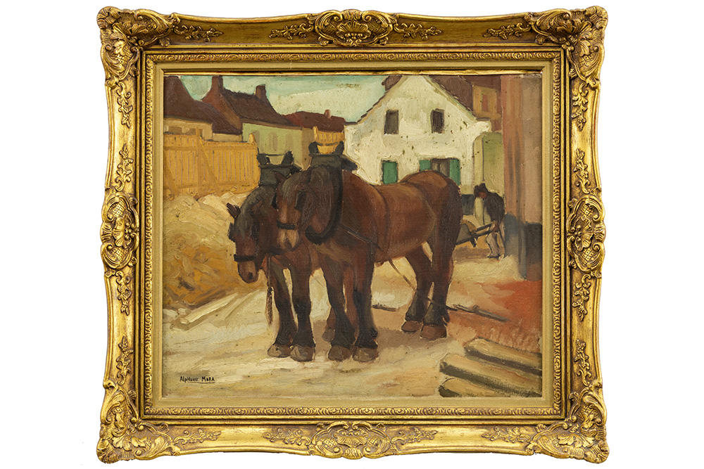 MORA ALPHONSE (1891 – 1977) olieverfschilderij op doek : “Trekpaarden” – 50 x 60 getekend