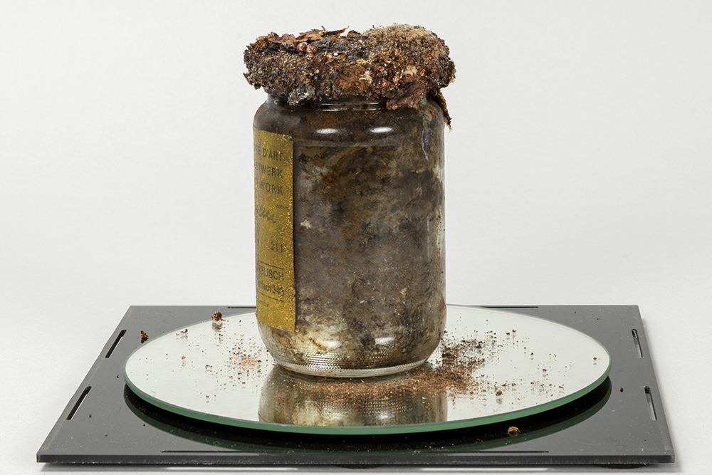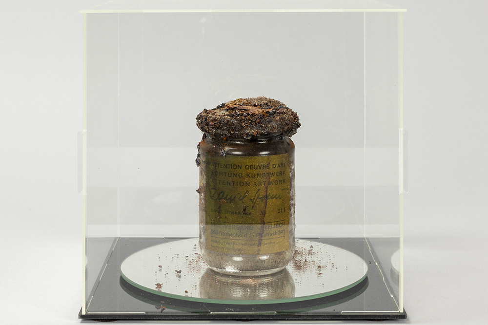 SPOERRI DANIEL (° 1930) object in gemengde techniek (glas, haring, papier en plastic) getiteld “Achtung Kunstwerk (Attention oeuvre d’art Attention Art Work)” – ca 14 cm hoog – in plexi box (21 x 21 x 21 cm) getekend, gedateerd 1968 en genummerd 211 op label editie van Vice-Versand Dit werk van Spoerri, voor wie voedsel een belangrijk thema is in zijn oeuvre, is te kaderen in zijn “Eat Art” – gedachte. In 1963 hield hij een soort performance in het Restaurant de la Galerie J in Parijs waar hij verschillende avonden kookte en hij opende op 18/6/68 een restaurant in Düsseldorf, waarboven hij in 1970 een “Eat Art” – galerij opende