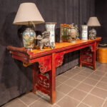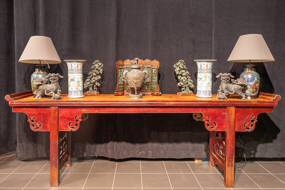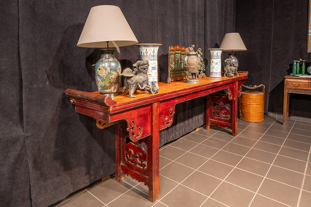 Goede antieke Chinese altaartafel uit de Qing-periode in nog deels gelakt hout en met gesculpteerde wangenpoten – 95 x 277 x 52 cm