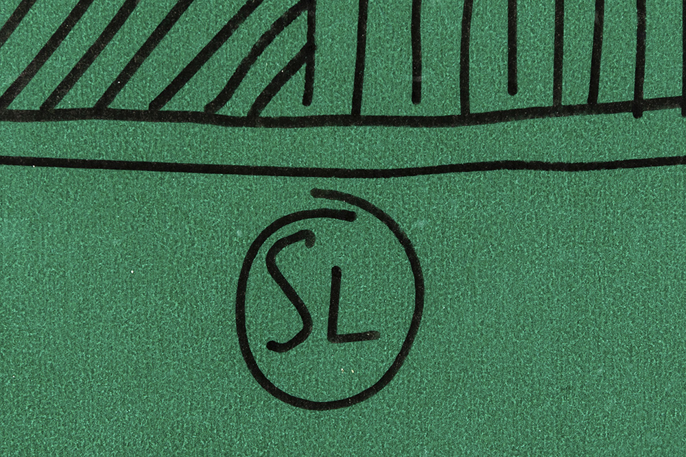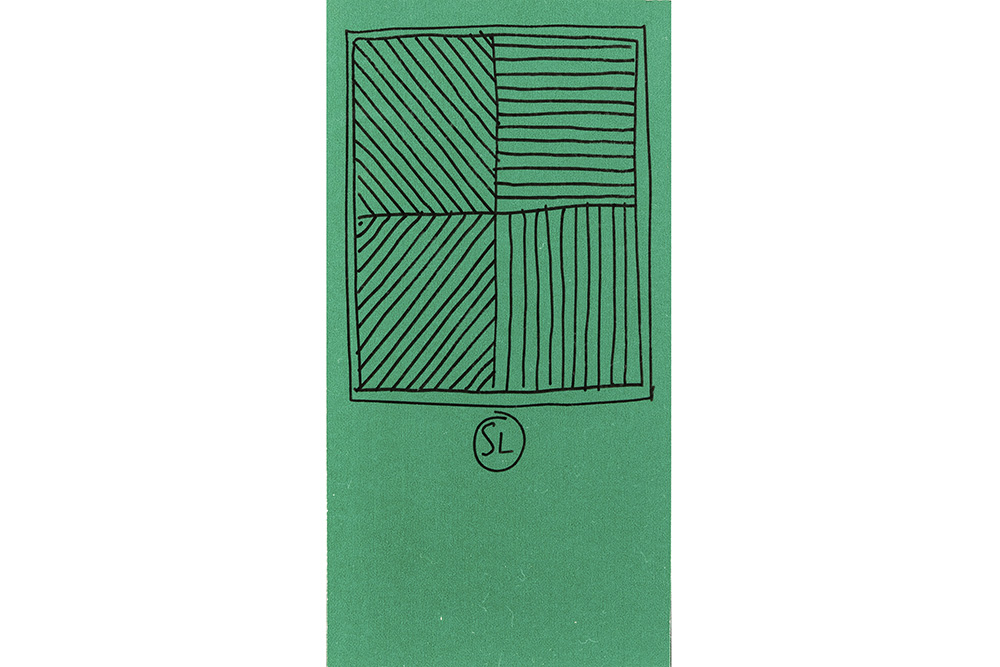 Sol LeWitt monogramed drawing in felt-tip pen on the back of an invitation for the exhibition ‘Sol LeWitt’ at Galerie Berndt Krips, Cologne dd 1989