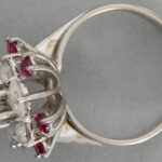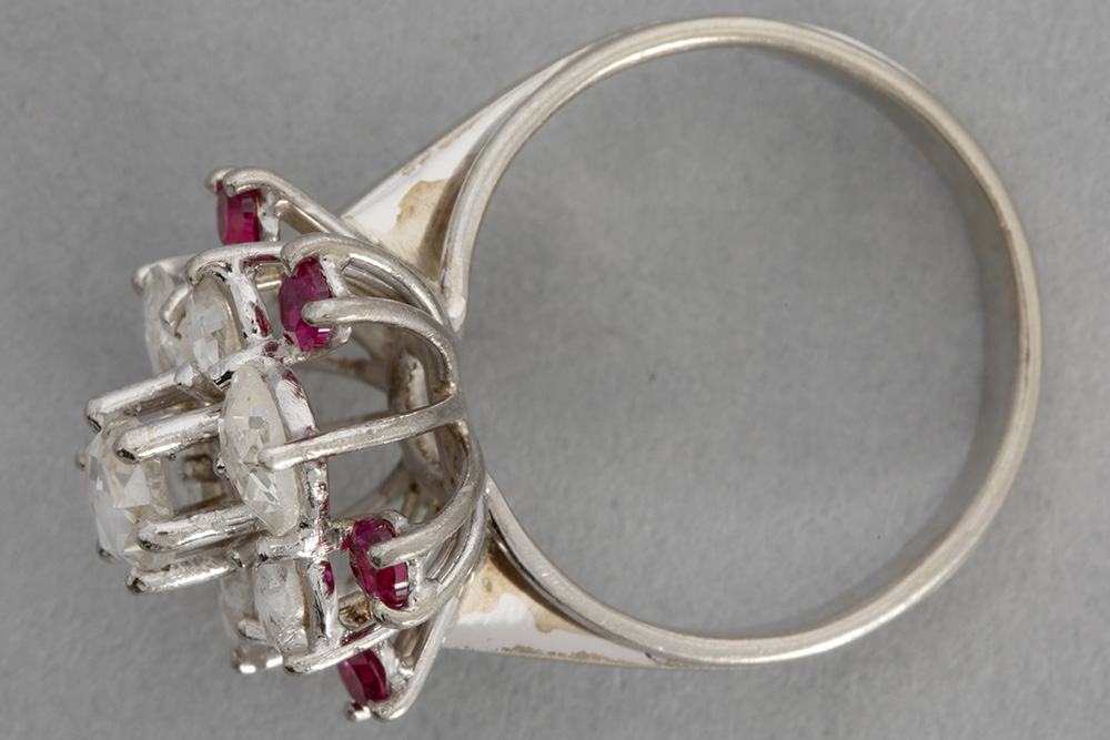 Ring met een apart bloemenmodel in witgoud (18 karaat) bezet met ca 1,50 karaat diamant in roosslijp en met zes kleine “rubis verneuil” stenen met typisch rode kleur – gewicht : 6,4 gram