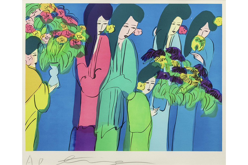 TING WALASSE (1929 – 2010) kleurlitho n° AP met een karakteristiek thema met vrouwen : “Offrande de fleurs” – 50 x 62 getekend
