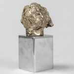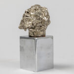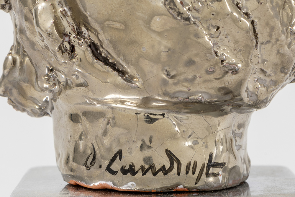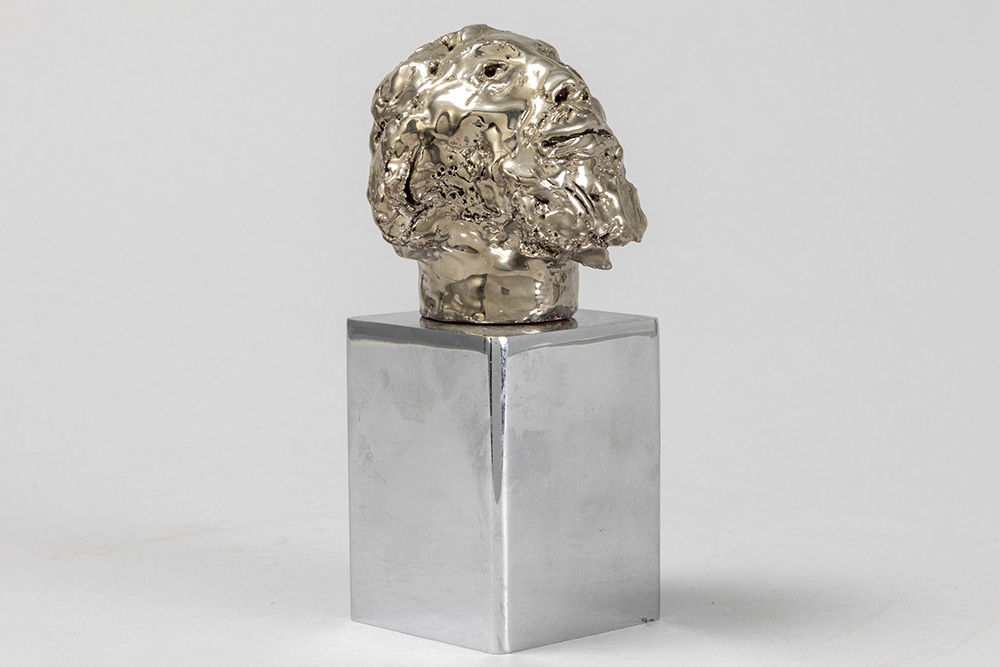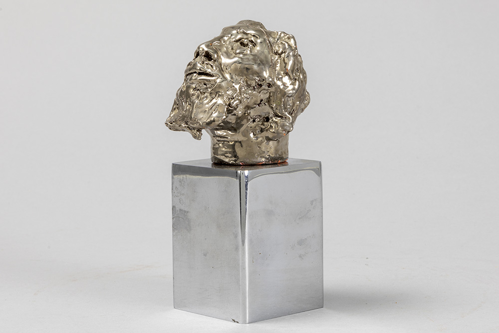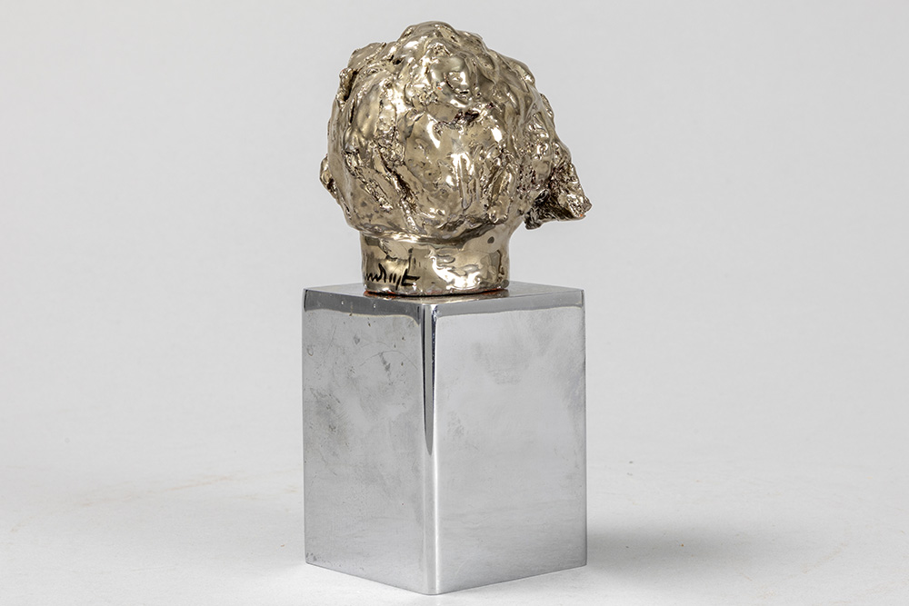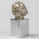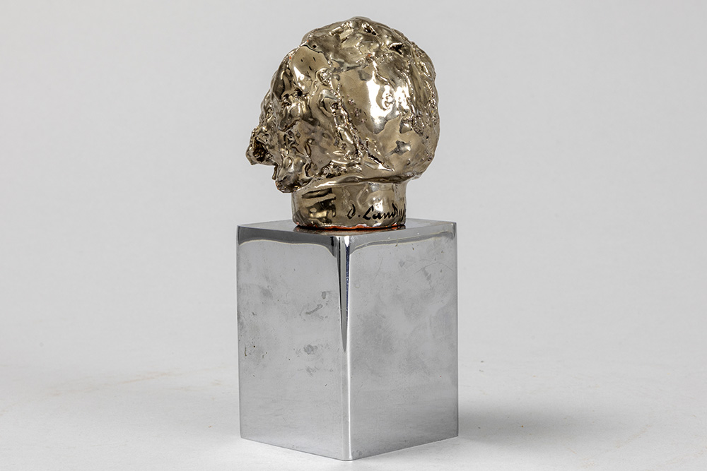 LANDUYT OCTAVE (1922 – 2024) sculptuur in keramiek met zilverpatine op een basis in gechromeerd metaal : “Hoofd van een man” – totale hoogte : 16 cm getekend