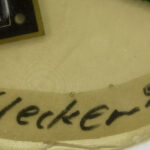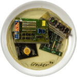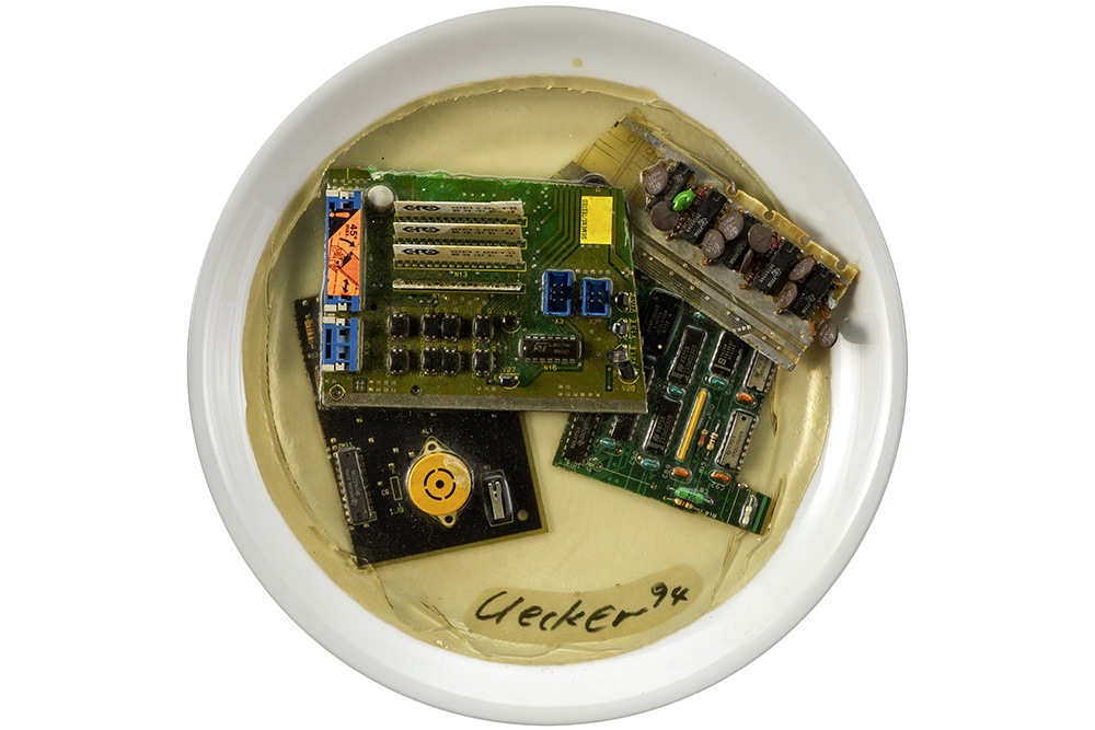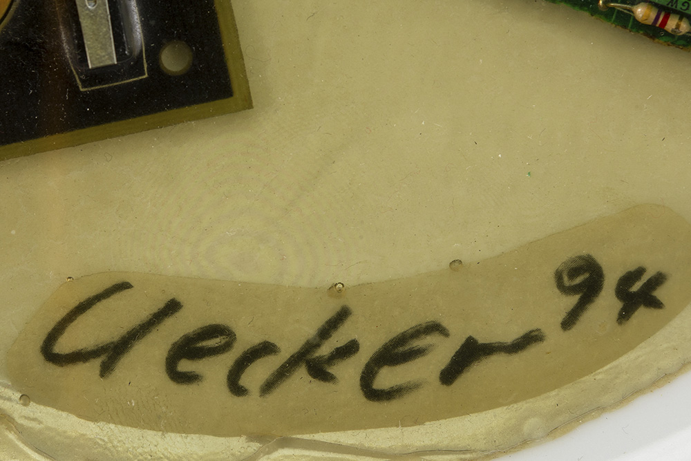 UECKER GÜNTHER (1930 – 2025) unieke sculptuur met een assemblage van elektronische componenten in hars op een porseleinen bord – diameter : 24,5 cm – ingekaderd getekend en gedateerd (19)94