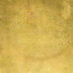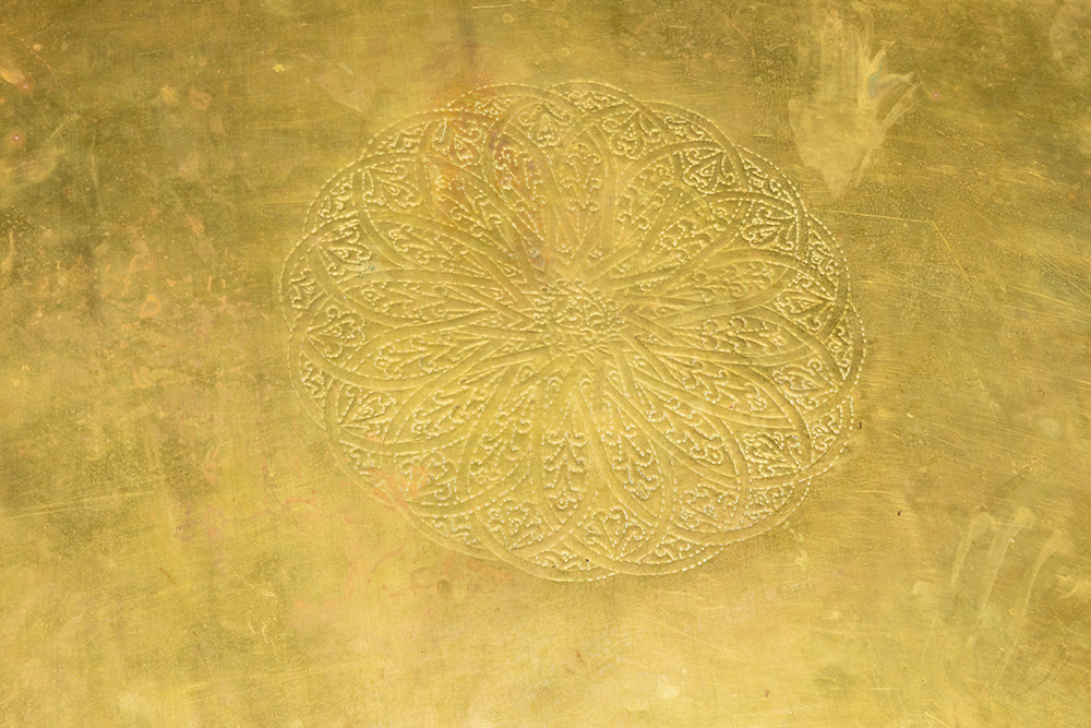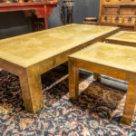 Oriëntalistische set van een grote (47 x 201 x 100 cm) en twee kleine (47 x 60 x 60 cm) salontafels in met koper bekleed hout met een gehamerd decor – ca 1990