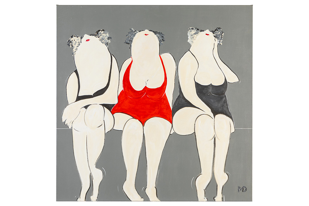 DROSSAERT MIEKE (° 1952) lot (2) : – schilderij in gemengde techniek op doek met een compositie met drie figuren – 100 x 100 gemonogrammeerd en op verso getekend en gedateerd 2008 – schilderij in gemengde techniek op doek getiteld “She” – 50 x 50 op verso getekend en gedateerd 2012 Worden verkocht met een door de kunstenares gesigneerde catalogus van de expo “Mille Caresses” dd 2024