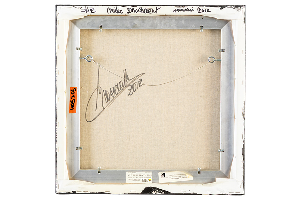 two mixed media paintings – with the monogram of and on the back the signature of Mieke Drossaert – dated 2008 and 2012 will be sold with the by the artist signed “Mille Caresses” catalogue dd 2024