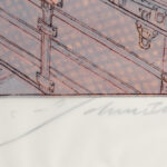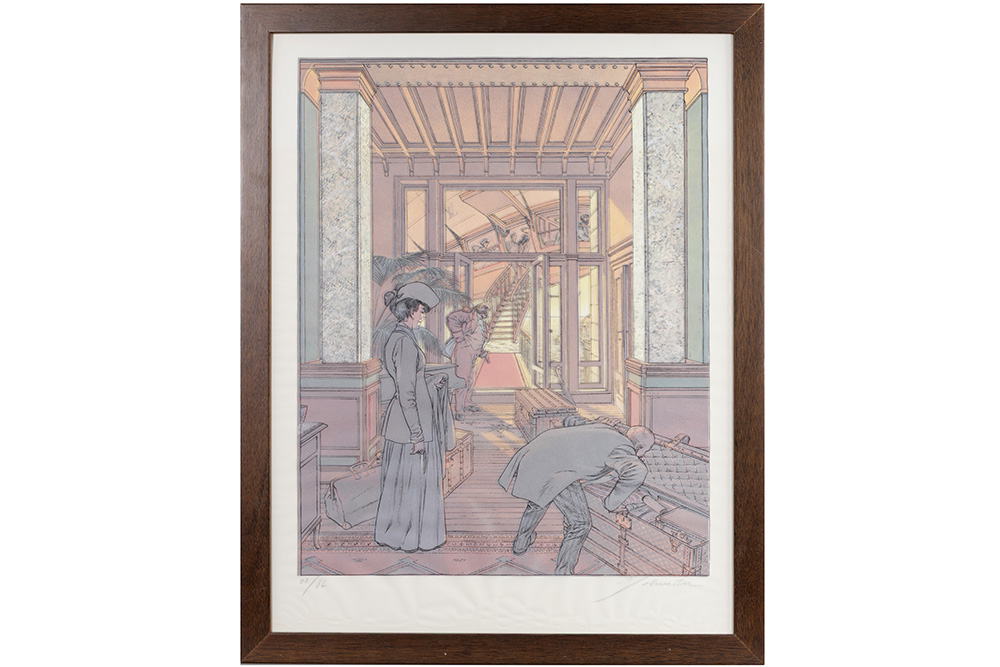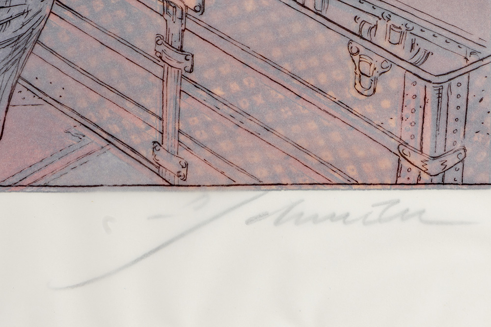 SCHUITEN FRANÇOIS (° 1956) dubbel werk met print in zwart op kalkpapier en een print in kleuren n° 02/82 in samenspraak met Louis Vuitton gemaakt en getiteld “Le monde du voyage Louis Vuitton” – 58 x 44 getekend editie van 2004 Schuiten is een Belgisch striptekenaar die vooral bekend is vanwege de reeks De Duistere Steden, die hij samen met Benoît Peeters maakte.