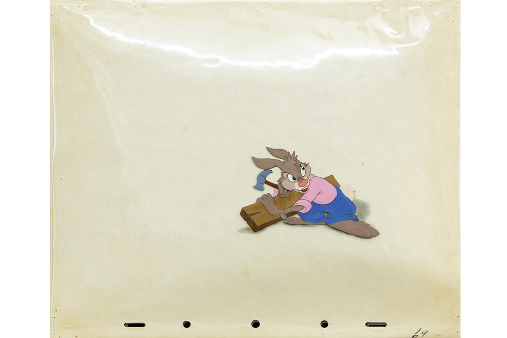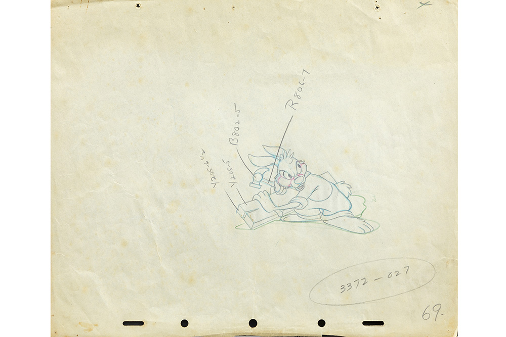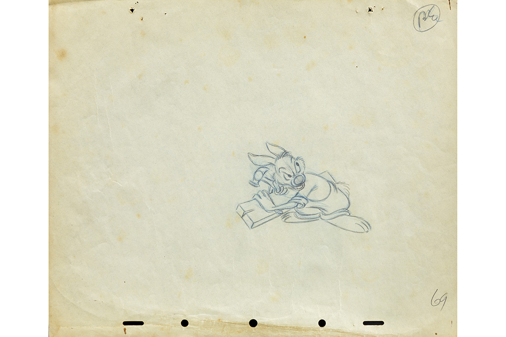 WALT DISNEY Studio : three drawings, two study drawings (one with directives) and one colored drawing on cellophane of the character “Br’er Rabbit”