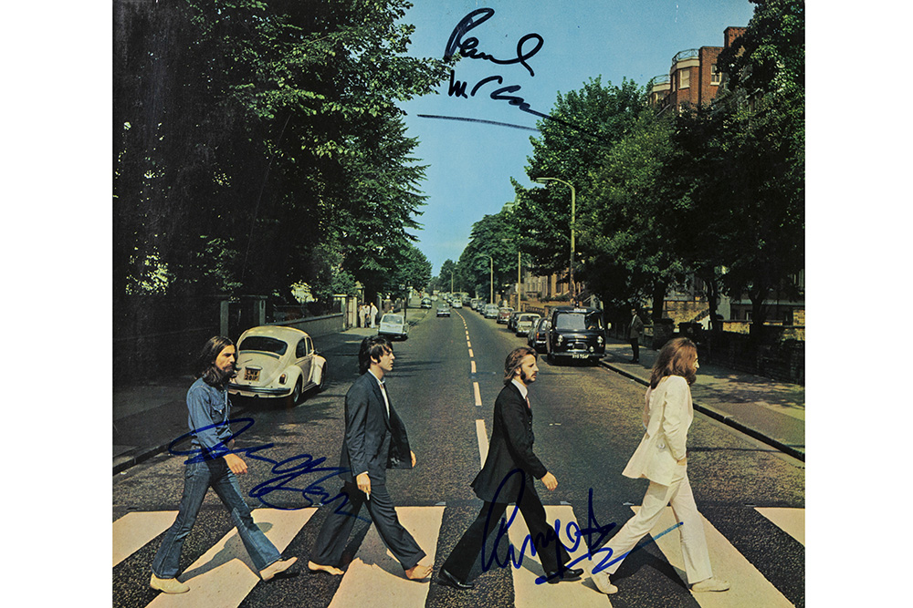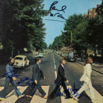 PAUL MC CARTHY – RINGO STARR – GEORGE HARRISON LP cover van het album “Abbey Road” met de beroemde foto met zebrapad – met elpee en ingekaderd door de drie gesigneerd in 1969