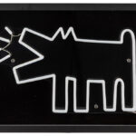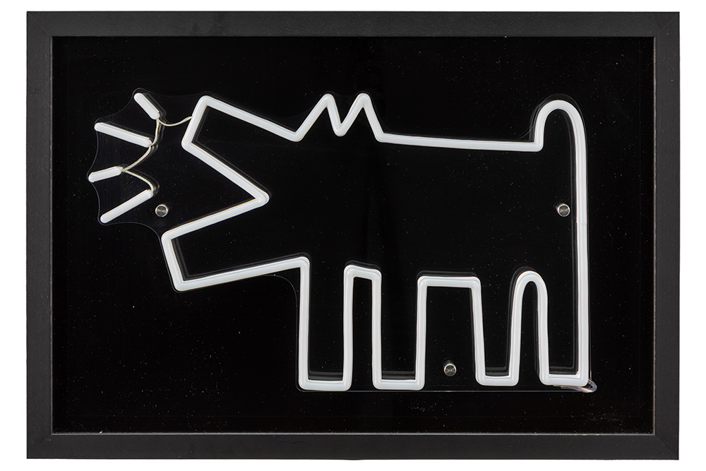 HARING KEITH (1958 – 1990) neon-led “Barking Dog” sculptuur in samenwerking met de “Estate of Keith Haring” gemaakt – in een houten showcase van 44 x 64 cm