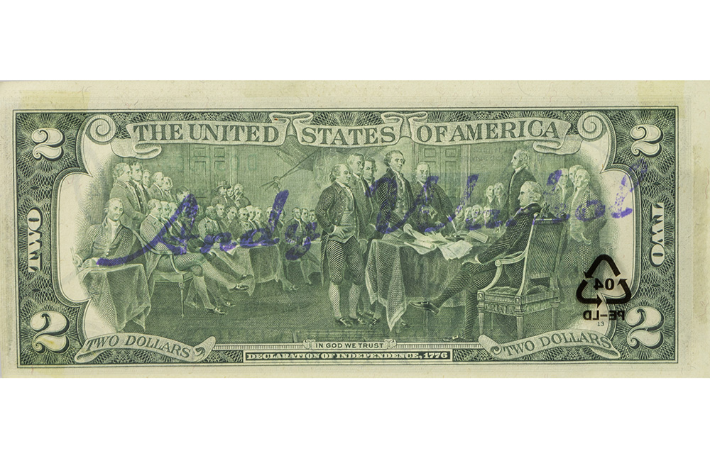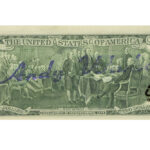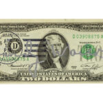 WARHOL ANDY (1928 – 1987) “Two Dollar” – bankbiljet (series 1976) waarop een “13 Cent”-postzegel is gekleefd – 6,5 x 15,5 getekend met zilvergrijze stift
