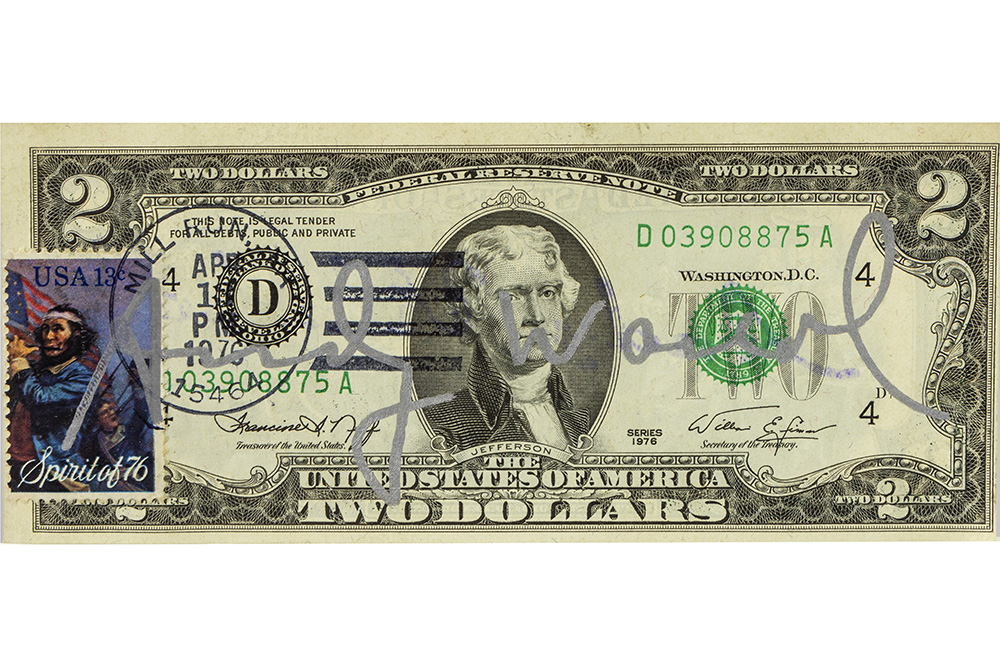 Andy Warhol signed “Two Dollar” banknote (Series 1976) on which a “13 Cent” stamp is affixed