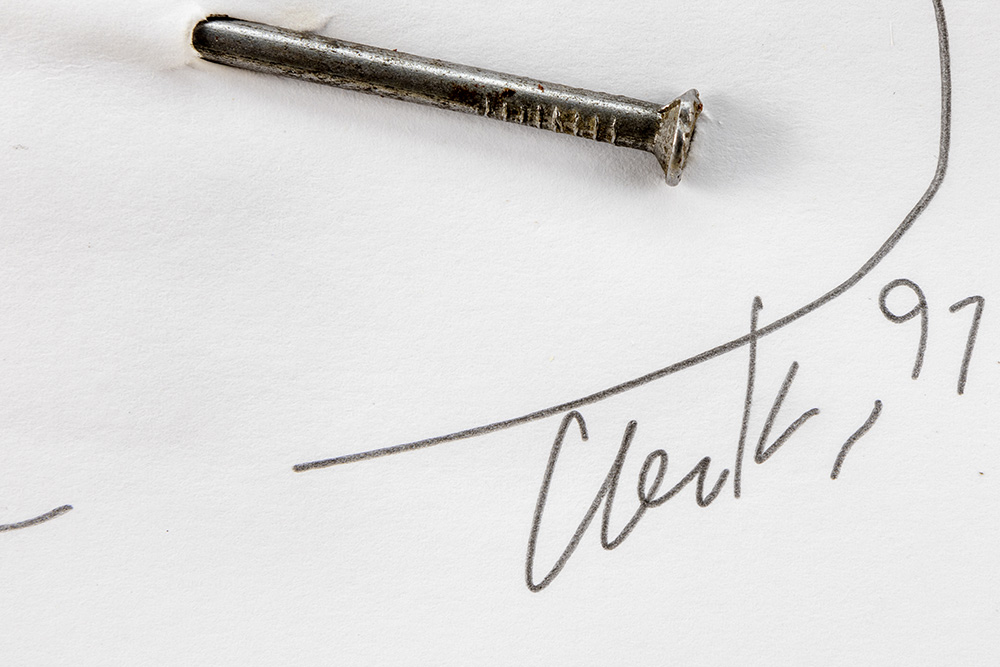 Günther Uecker signed and 1997 dated drawing in pencil with a nail through the paper