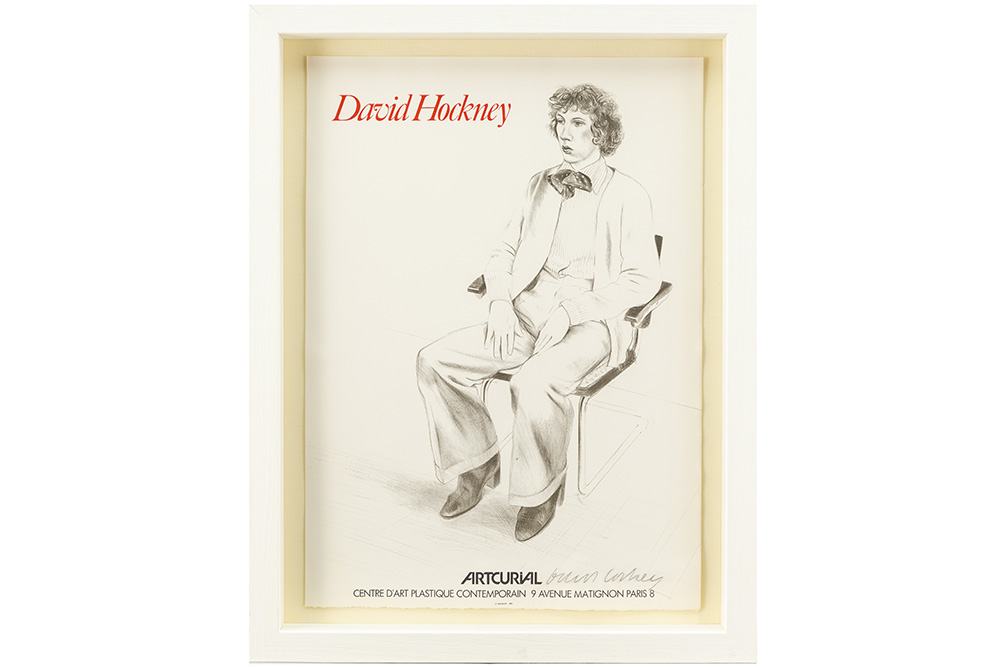HOCKNEY DAVID (° 1937) kleurlitho als poster voor de tentoonstelling van Artcurial in het Centre d’Art Plastique Contemporain te Parijs in 1978 die Hockney’s partner Gregory Evans afbeeldt zittend op een stoel – 72 x 52 getekend editie door Mourlot Paris