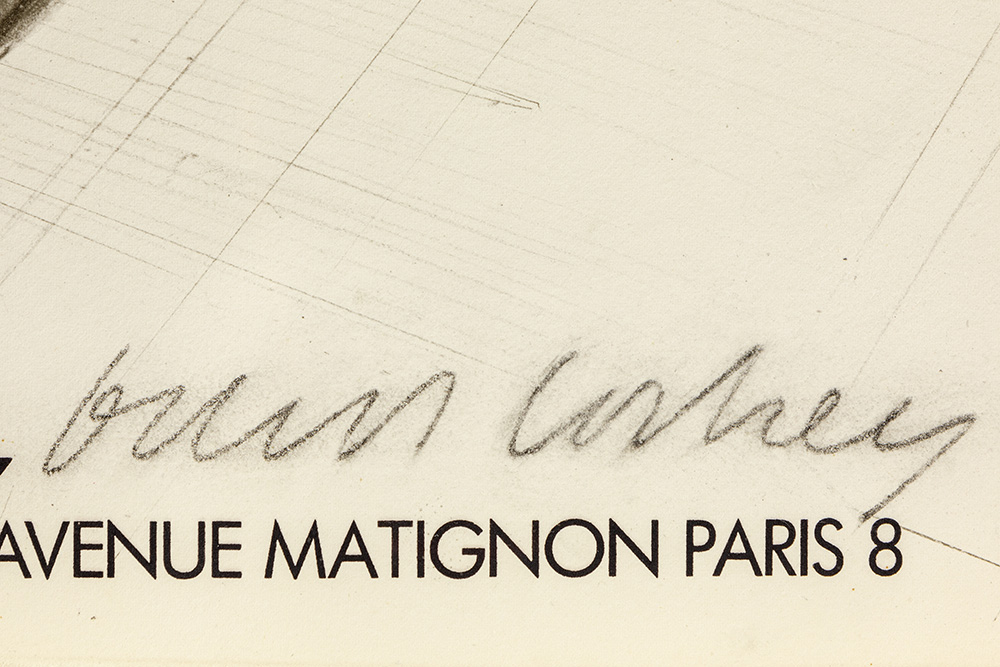 David Hockney signed lithograph printed in colors as poster for the exhibition by Artcurial in the Centre d’Art Plastique Contemporain, Parijs in 1978 with Hockney’s partner Gregory Evans on a chair edition by Mourlot Paris