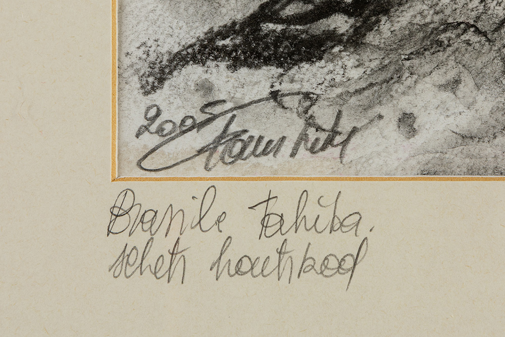 Onleesbaar getekende houtskoolschets : “Compositie” – 29 x 29 gedateerd 2005