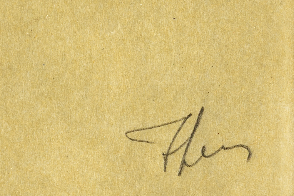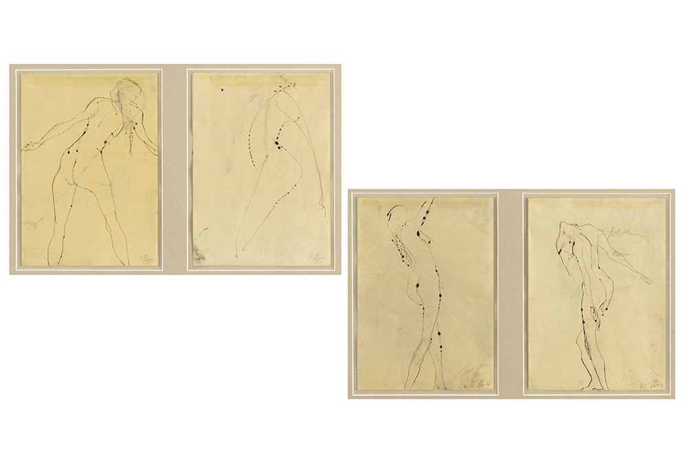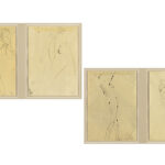 Vier samen ingekaderde tekeningen met een onleesbare signatuur – telkens 29 x 20 cm
