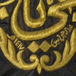 20th Century Saoudi Arabian square kiswah fragment with gilt metal thread on a black silk ground, featuring a central cartouche inscribed in Thuluth script (“Ya Hayyu Ya Qayyum”) and surrounded by intricate arabesque motifs