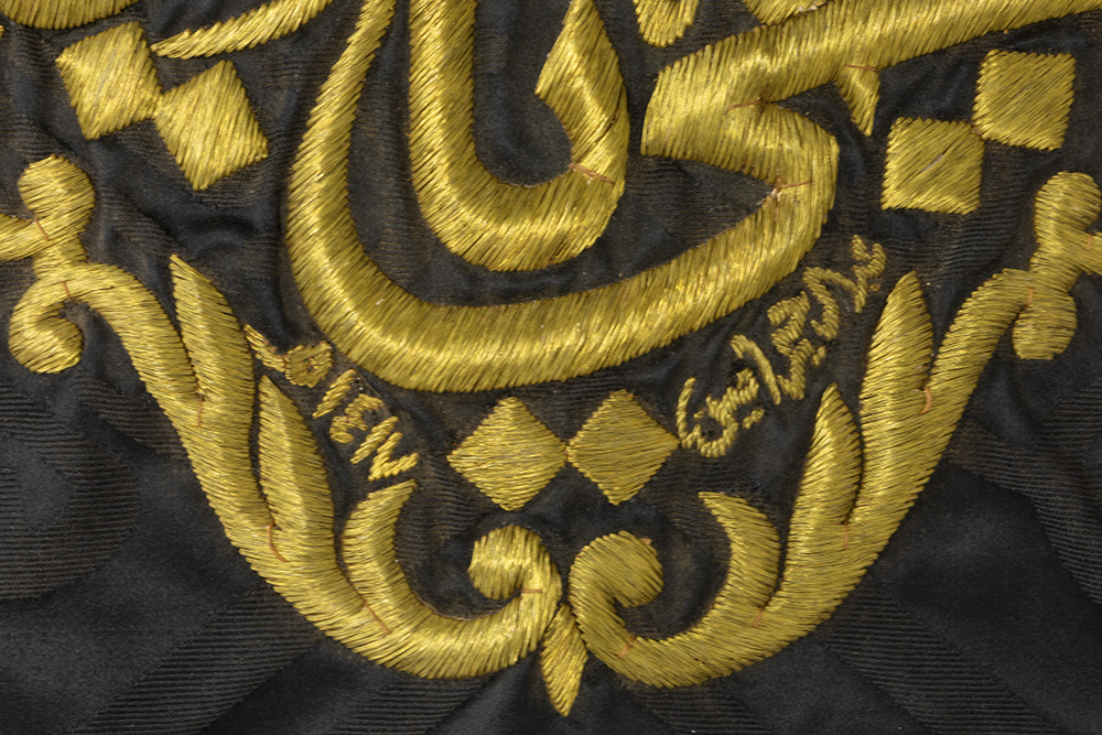 SAOEDI-ARABIË – 20° EEUW vierkant kiswah-fragment met vergulde metaaldraad op een zijden zwarte doek met centraal een cartouche met Thuluth scriptuur (“Ya Hayyu Ya Qayyum”) omringd door weelderige arabeske patronen – 85 x 68 cm